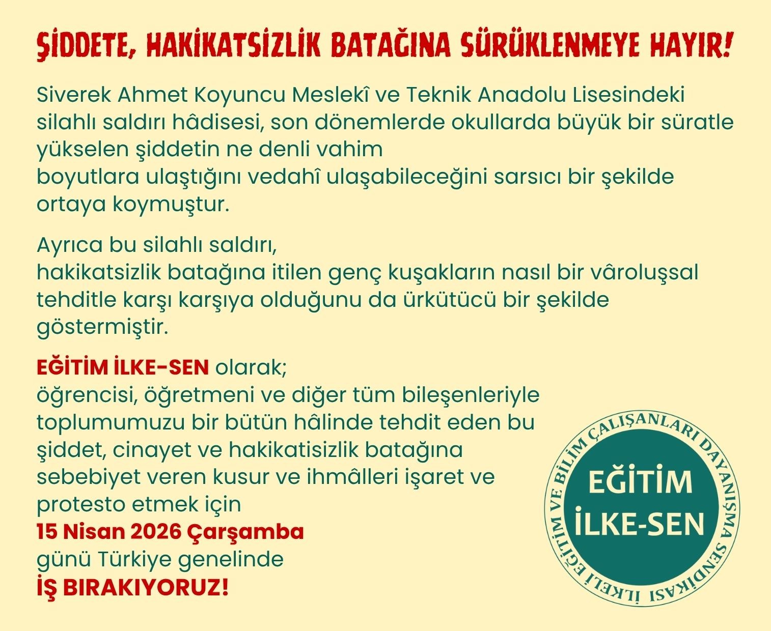 EĞİTİM İLKE-SEN olarak; öğrencisi, öğretmeni ve diğer tüm bileşenleriyle toplumumuzu bir bütün hâlinde tehdit eden bu şiddet, cinayet ve hakikatsizlik batağına sebebiyet veren kusur ve ihmâlleri işaret ve protesto etmek için 15 Nisan 2026 Çarşamba günü Türkiye genelinde iş bırakıyoruz!